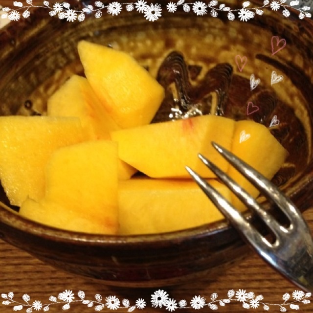 おやつの黄金桃はサツキさんが剥いてくれたもの。