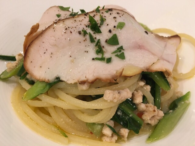 スモークした七面鳥とプンタレッタのペペロンチーノ