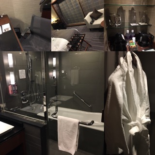 ・ホテルの都合でまさかの最上階の部屋案内。ガラス貼りのお風呂とかバスローブとか充実のアメニティとか…
