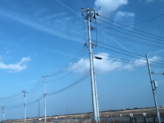・仙台空港前の空。これから天候が悪くなるので飛行機雲がくっきり