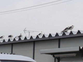 市場の事務所の屋根に止まろうとするから…めっちゃ低空飛行。